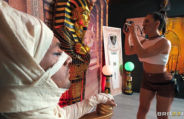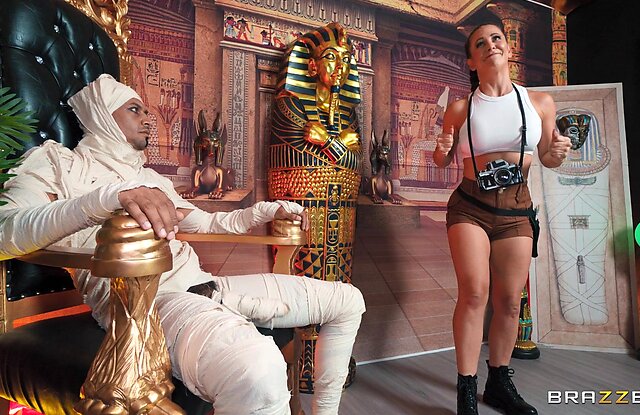 Порно онлайн: Красотка Cherie Deville делала фотосьемку в музее и увидела на троне мумию в виде фараона. Она стала фотографировать его, но затем увидел что у него стояк. Когда она осовбодила член, то поняла что таких огромных "болтов" она ещё не встречала и тут было грех не оприходовать его своей киской.